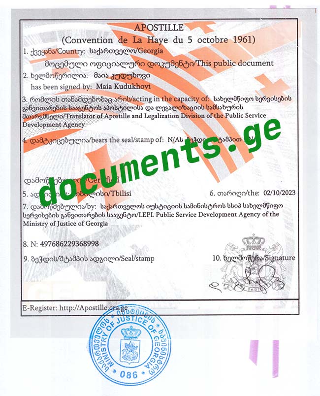 Апостиль в Грузии проставляется на документах независимо от их перевода. Он может быть выполнен печатью или штампом на самоклеящемся бумажном носителе с защитными элементами.